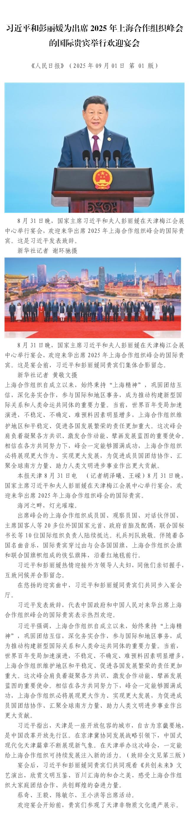 习近平和彭丽媛为出席2025年上海合作组织峰会的国际贵宾举行欢迎宴会