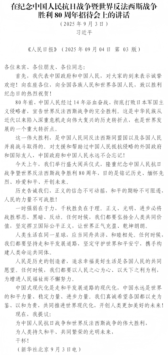 在纪念中国人民抗日战争暨世界反法西斯战争 胜利80周年招待会上的讲话