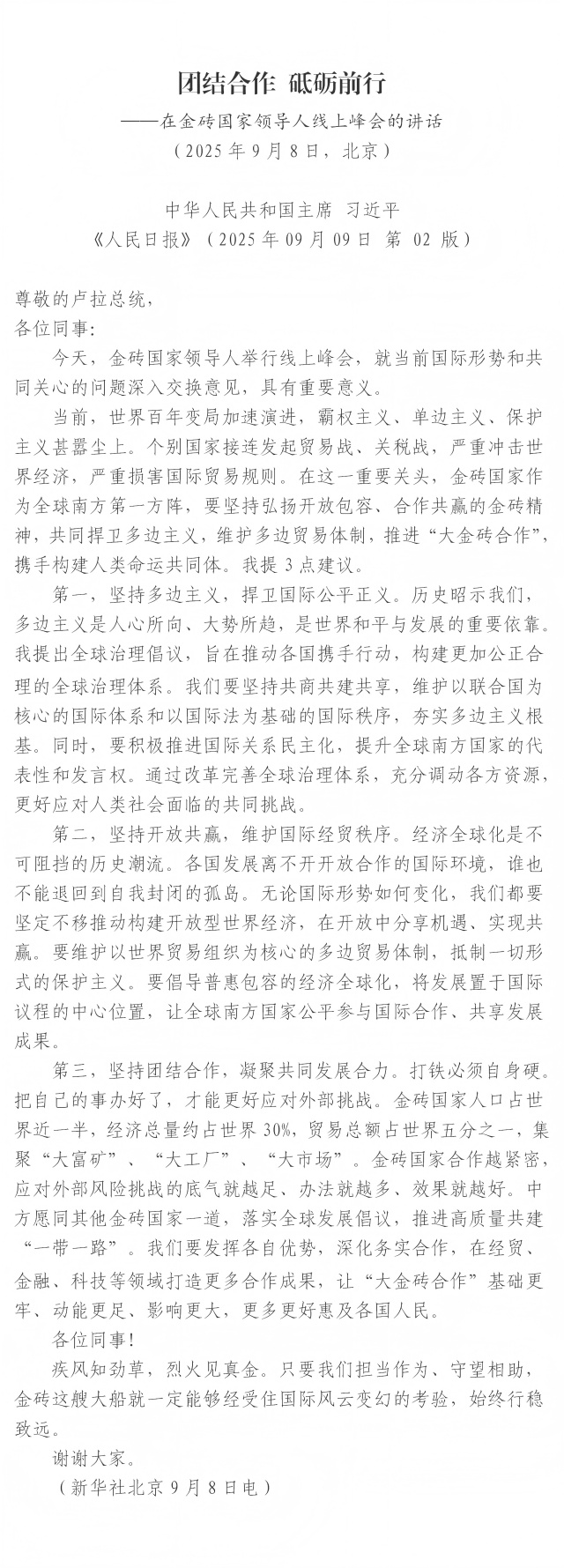团结合作 砥砺前行 ——在金砖国家领导人线上峰会的讲话