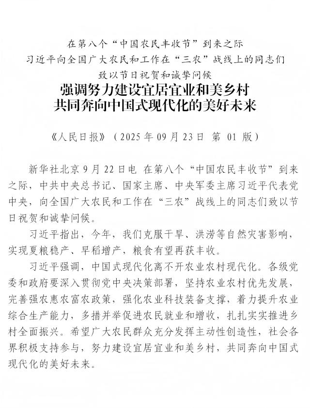 在第八个“中国农民丰收节”到来之际习近平向全国广大农民和工作在“三农”战线上的同志们 致以节日祝贺和诚挚问候