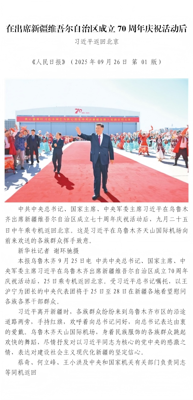 在出席新疆维吾尔自治区成立70周年庆祝活动后