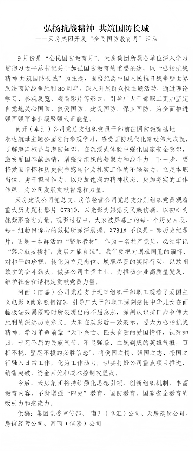 弘扬抗战精神 共筑国防长城 ——天房集团开展“全民国防教育月”活动