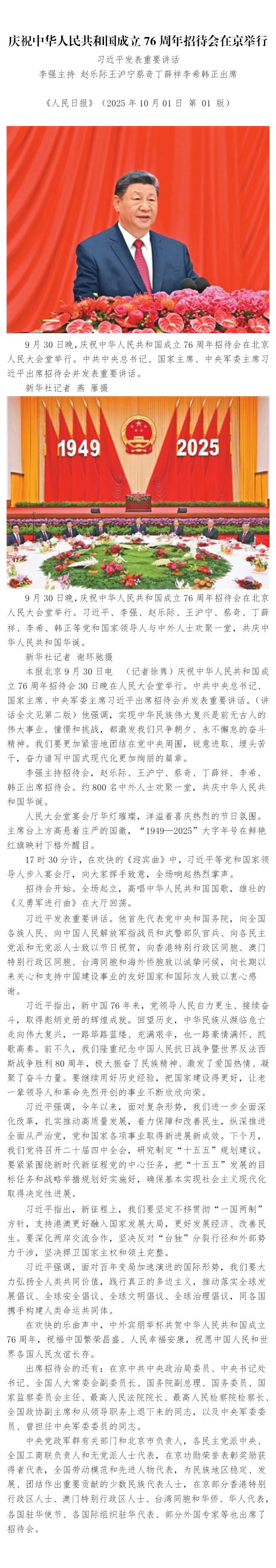 庆祝中华人民共和国成立76周年招待会在京举行