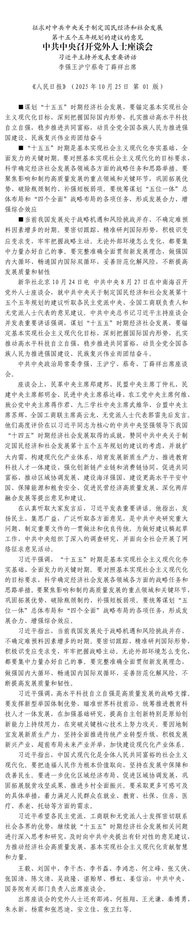 征求对中共中央关于制定国民经济和社会发展 第十五个五年规划的建议的意见 中共中央召开党外人士座谈会 习近平主持并发表重要讲话