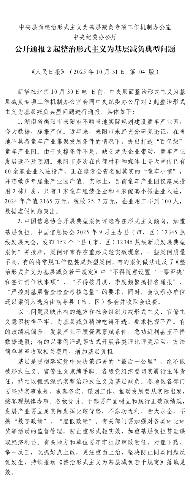 中央层面整治形式主义为基层减负专项工作机制办公室 中央纪委办公厅 公开通报2起整治形式主义为基层减负典型问题