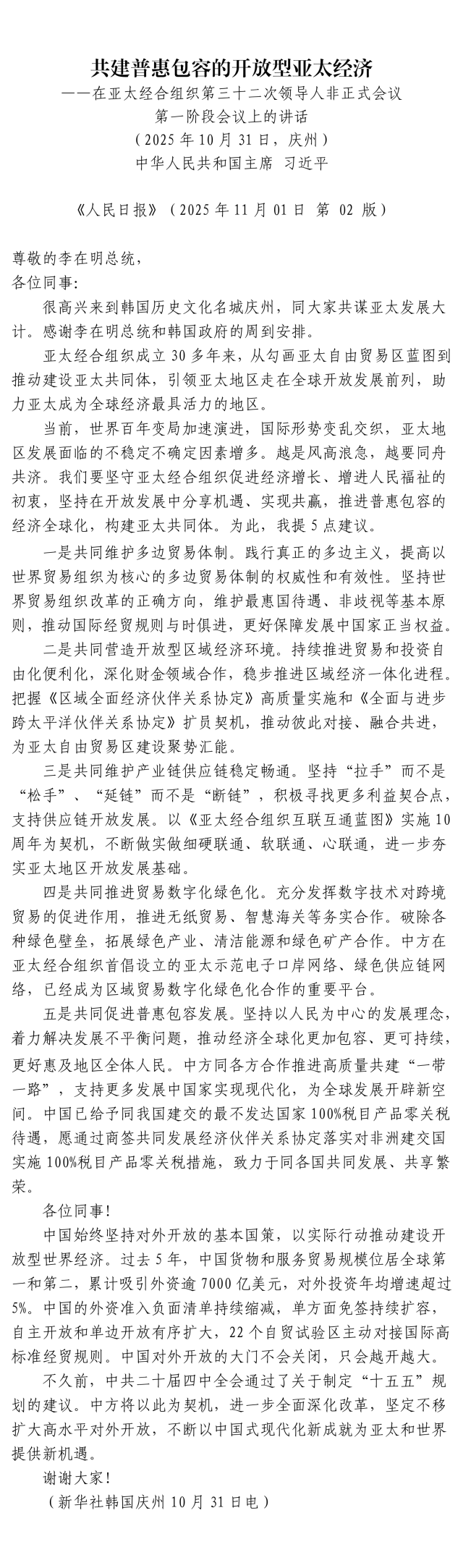 共建普惠包容的开放型亚太经济
