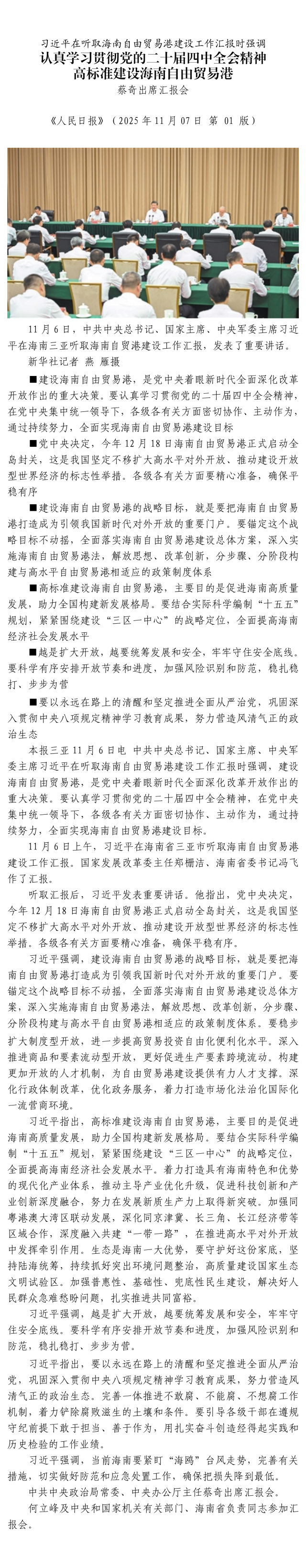 习近平在听取海南自由贸易港建设工作汇报时强调 认真学习贯彻党的二十届四中全会精神 高标准建设海南自由贸易港