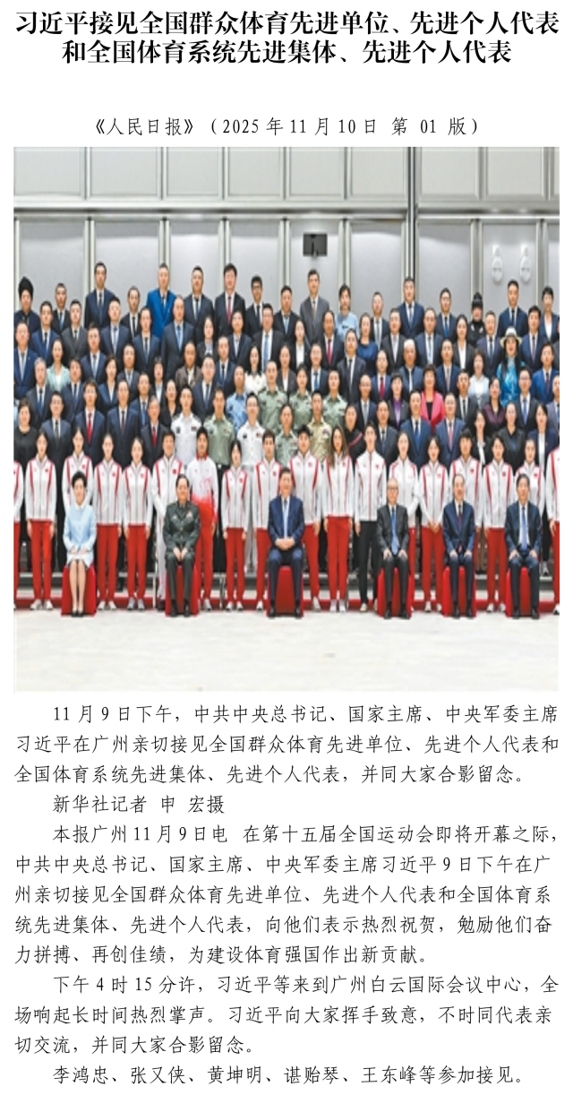 习近平接见全国群众体育先进单位、先进个人代表和全国体育系统先进集体、先进个人代表
