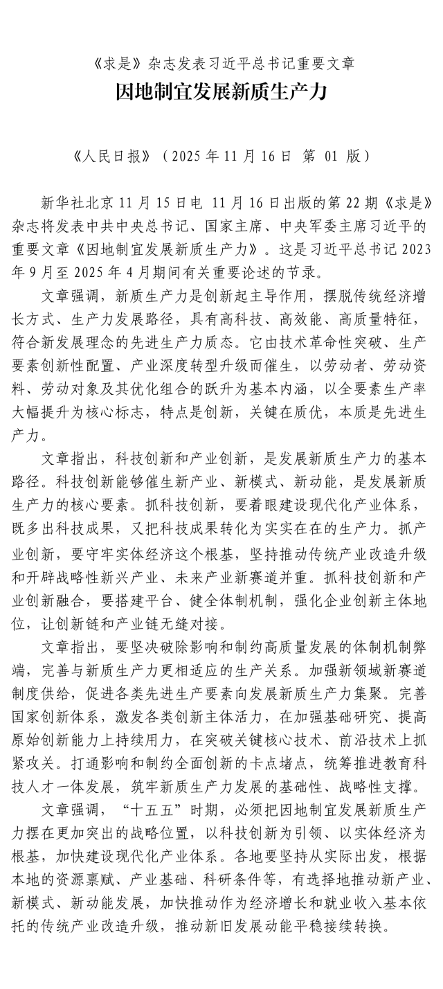 《求是》杂志发表习近平总书记重要文章 因地制宜发展新质生产力
