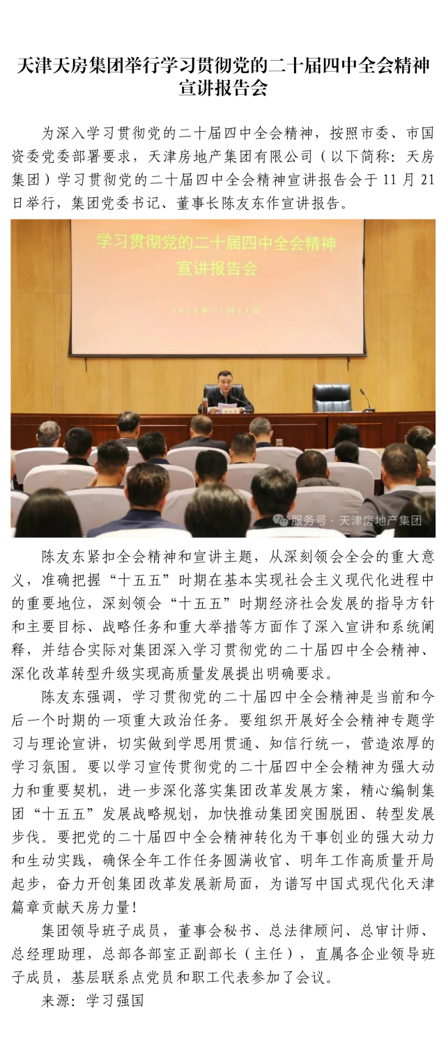 天津天房集团举行学习贯彻党的二十届四中全会精神宣讲报告会