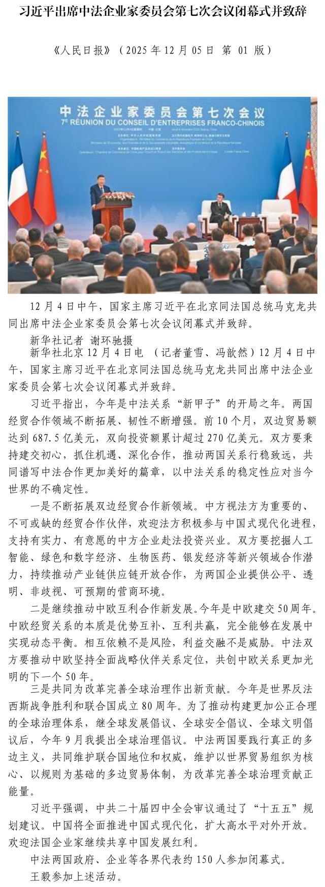 习近平出席中法企业家委员会第七次会议闭幕式并致辞