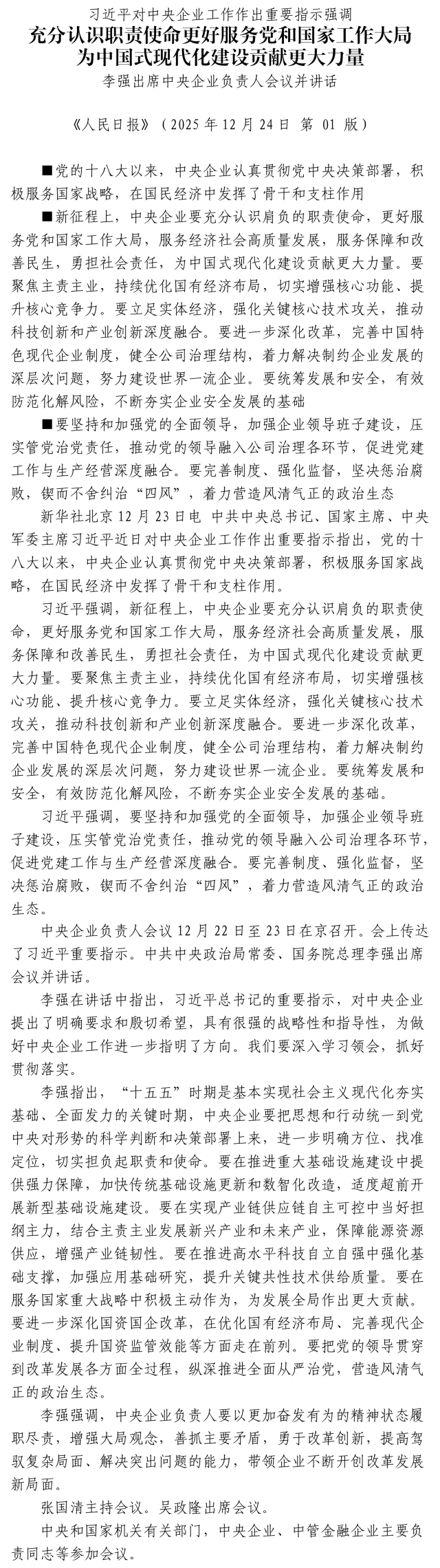 习近平对中央企业工作作出重要指示强调