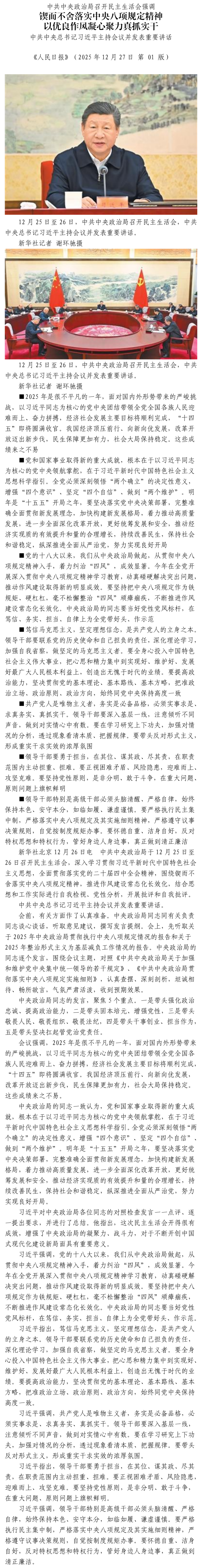 中共中央政治局召开民主生活会强调