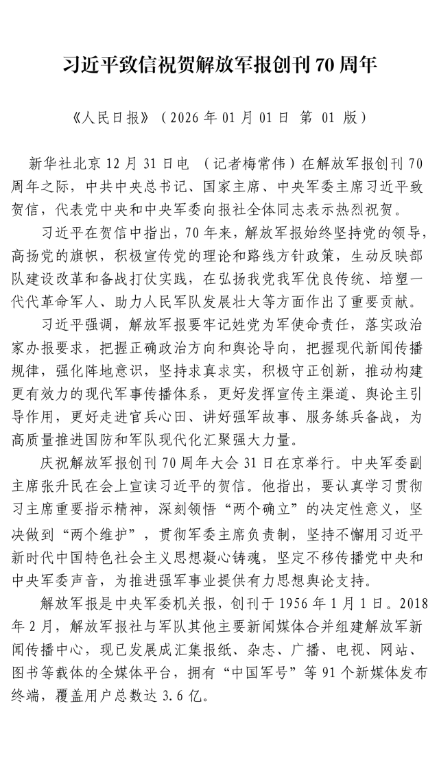 习近平致信祝贺解放军报创刊70周年