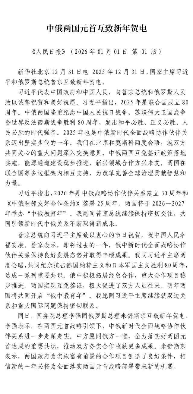中俄两国元首互致新年贺电