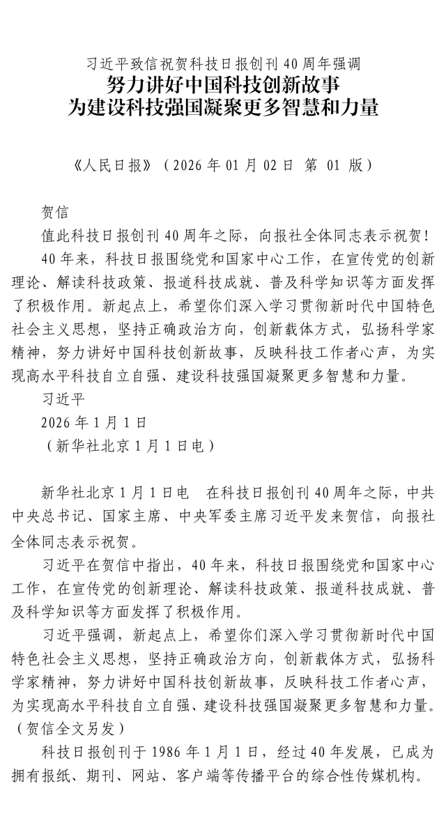 习近平致信祝贺科技日报创刊40周年强调