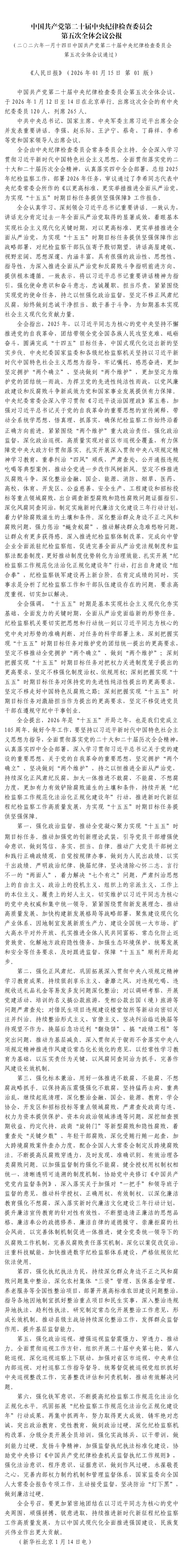 中国共产党第二十届中央纪律检查委员会第五次全体会议公报