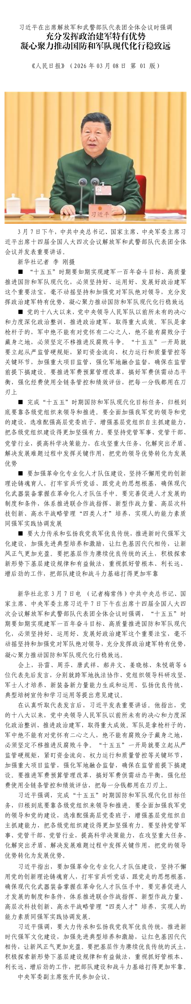 习近平在出席解放军和武警部队代表团全体会议时强调