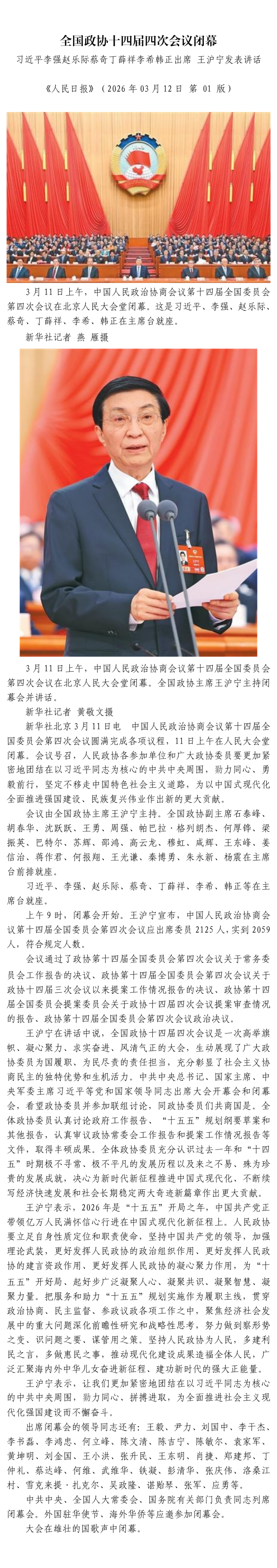 全国政协十四届四次会议闭幕