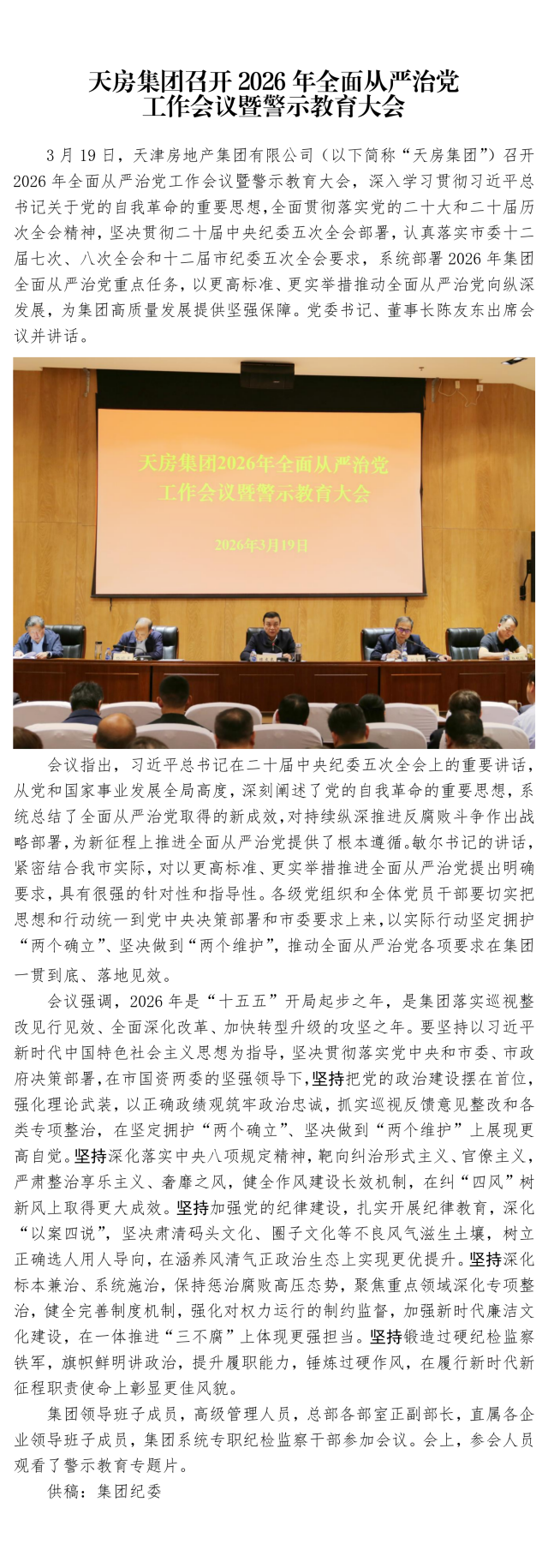 天房集团召开2026年全面从严治党工作会议暨警示教育大会