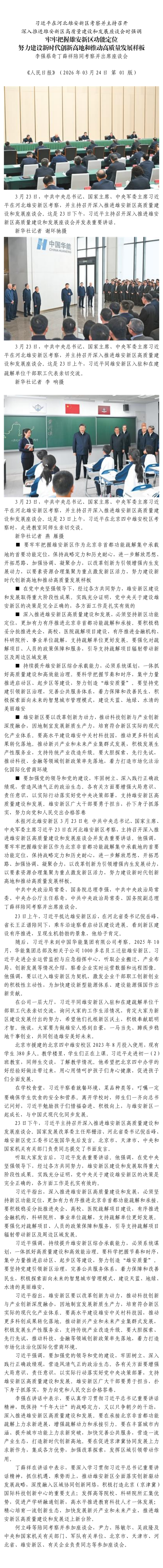 习近平在河北雄安新区考察并主持召开深入推进雄安新区高质量建设和发展座谈会时强调