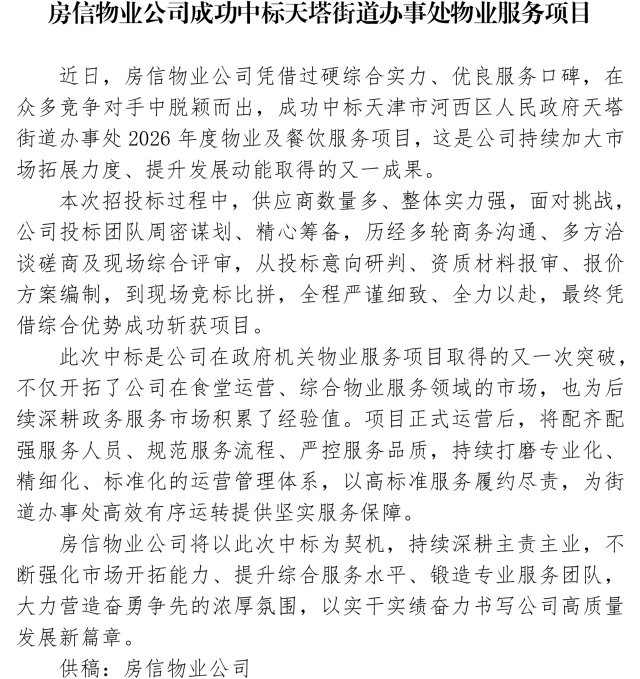 房信物业公司成功中标天塔街道办事处物业服务项目