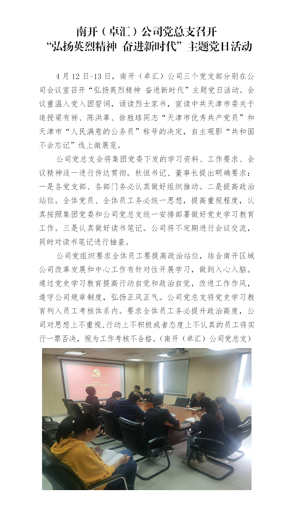 南开(卓汇)公司党总支召开“弘扬英烈精神 奋进新时代”主题党日活动
