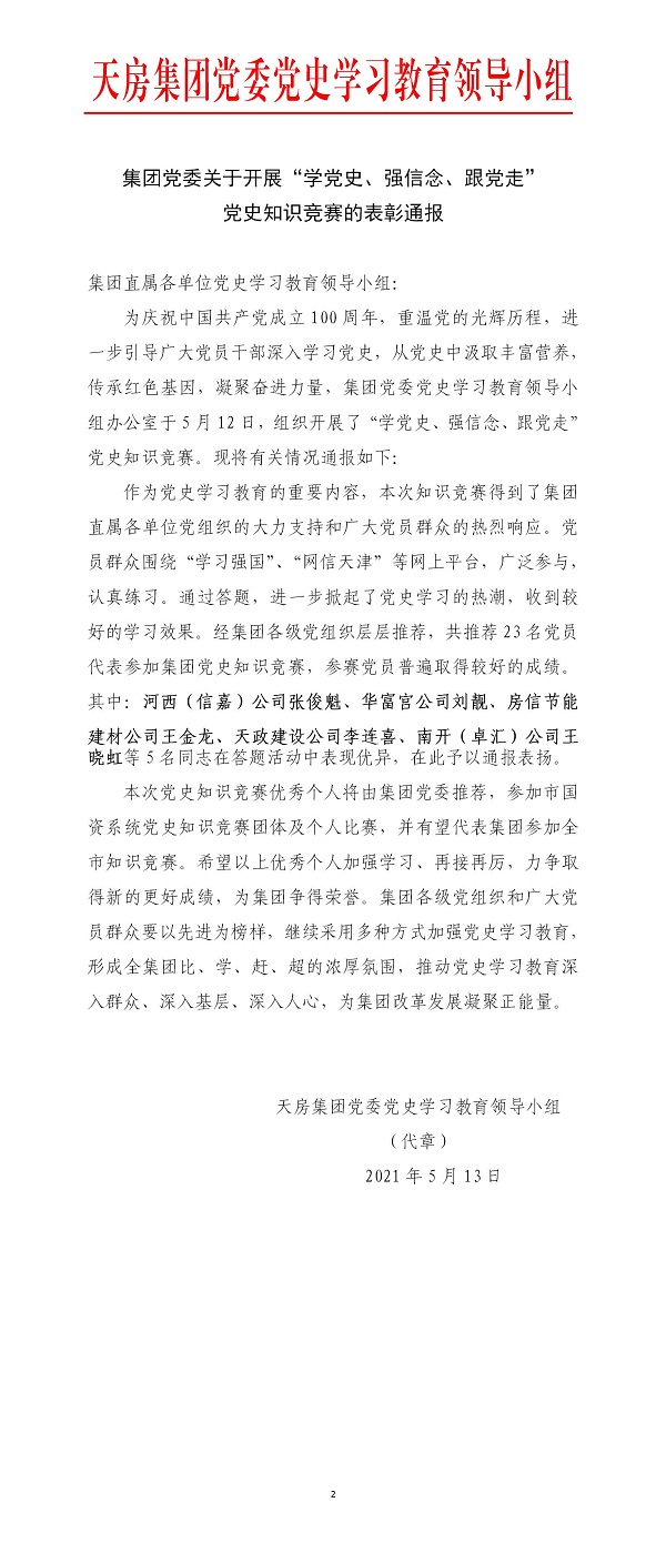 集团党委关于开展“学党史、强信念、跟党走”党史知识竞赛的表彰通报