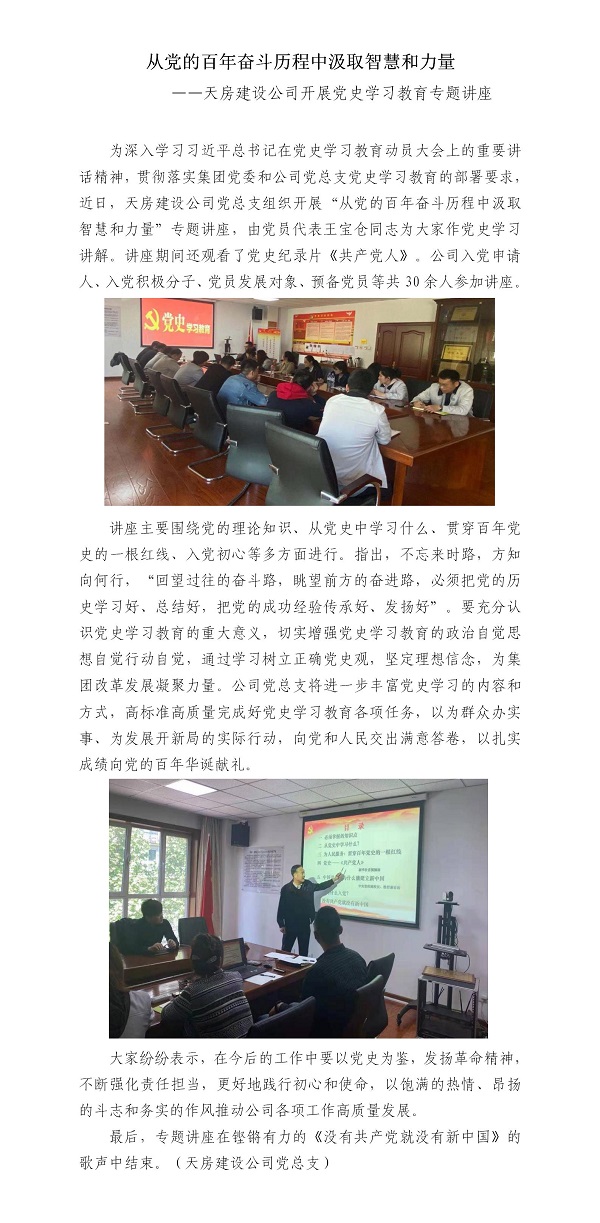 从党的百年奋斗历程中汲取智慧和力量 ——天房建设公司开展党史学习教育专题讲座